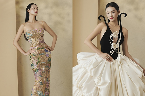 Á hậu Miss Universe Vietnam Quỳnh Anh nổi bật với chiếc đầm dài thêu họa tiết xứ Huế đính kết thủ công tỉ mỉ.